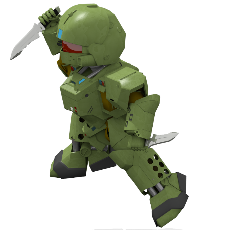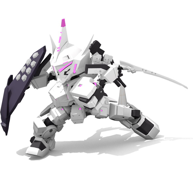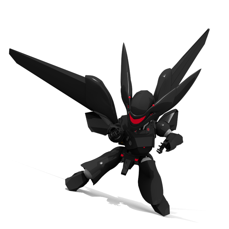 ブレイズ・レイヴンまずはブレイズ・レイヴン。上から降りてくるイメージでポーズを決めていますが、エフェクトがないとやはり少々寂しい感じ。バーニアのエフェクトや体のブレなどBlenderの機能を使えば可能なはずですが、今後の勉強課題として。